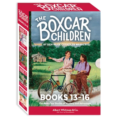 The paperback editions of The Boxcar Children Mysteries: #13, Snowbound Mystery; #14, Tree House Mystery; #15, Bicycle Mystery; and #16, Mystery in the Sand are offered together in a cardboard case.